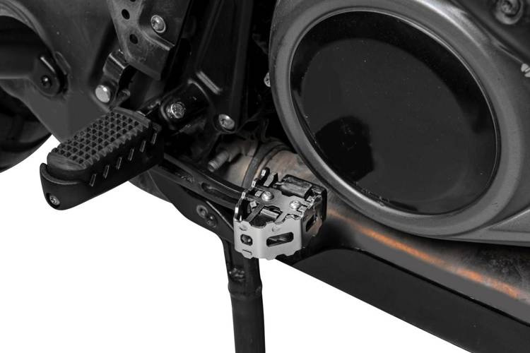 A firm footing on the brake is a basic necessity, especially when riding off-road. This is why the foot brake pedal extension we developed for the Pan America is serrated just like our proven *Works* long-distance foot pegs.Its surface area is appreciably larger than the original part to make sure your boot never misses the pedal again. The extension is 4 mm higher and 16 mm wider than the original. The special double-sided design ensures that the rotatability of the original brake lever end piece is maintained.The extension is made from 2 mm thick electropolished stainless steel, making it virtually indestructible. Fitting it onto the existing mounting points is simple and straightforward.Only for break lever of "Special"!