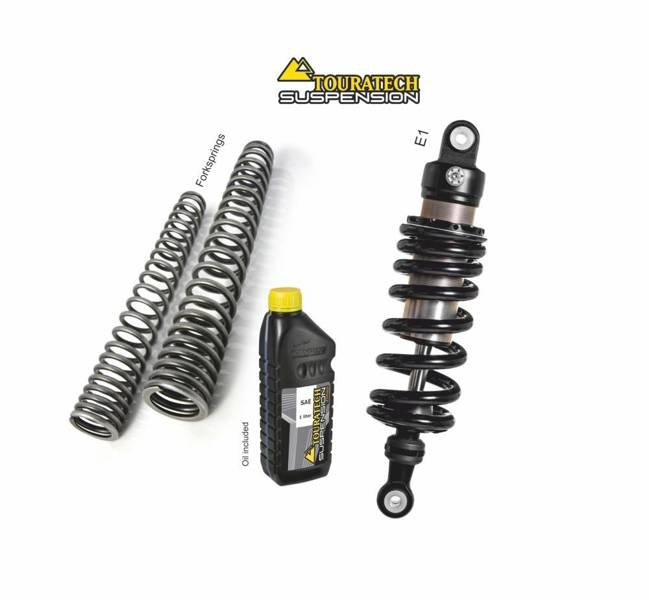 A lowering with fork springs and an E1 shock absorber from Touratech Suspension. They achieve a sensible lowering by -50mm without a deterioration of the driving characteristics. Of course, some ground clearance is lost. The suspension components are perfectly tuned to the BMW G310GS and offer a significantly improved response and higher safety at the limit than the original suspension elements. Info: Only fits for "BMW G310GS 2017-2019 The facts:- Touratech Suspension shock absorber in gas/oil emulsion design- Adjustable spring preload- 50 click adjustable rebound damping- Stepless progressive black coated spring- Piston rod made of chrome-molybdenum steel, ø 16 mm- Damper piston ø 36 mm- Generously dimensioned damper tube- Constant damping even under hard use- High-quality finish- Forksprings steplessly progressive- With GOP Delivery includes- Ready-to-install E1 shock absorber -50mm- Adjustment tool- fork springs -50mm - including detailed instructions. - matching fork oil. - Paste to improve the lubricity of the dip tubes.- installation instructions, Our recommendation: The conversion of the replacement springs should be made by a specialist workshop. Do you have any further questions? We will be happy to advise you personally.E-mail: suspension@suspension.de Phone +49 (0)7728-9279-1555Please use our chassis check sheet and send us the completed form.