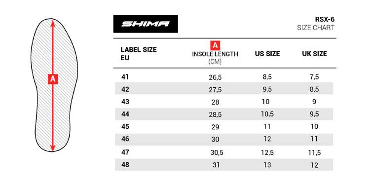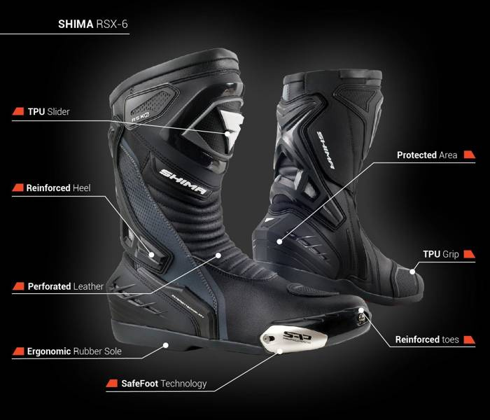 Buty RSX-6 to sportowy but o ergonomicznie pochylonej konstrukcji dopasowanej do pozycji motocyklisty. Na boku znajduje się slider TPR. Poprzecznie wzmacniana podeszwa w systemie SafeFoot. Specjalna syntetyczna nakładka umieszczona z przodu buta pozwala precyzyjniej obsługiwać dźwignię zmiany biegów.