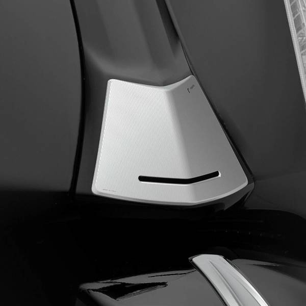 Osłona klaksonu Rizoma jest wykonana z kawałków aluminium. Oprócz dopracowanej estetyki osłona pozwala na zachowanie czystego i klarownego dźwięku. Mocuje się go bezpośrednio do oryginalnej przedniej pokrywy za pomocą wspornika i jest dostępna w kolorze srebrnym oraz czarnym.