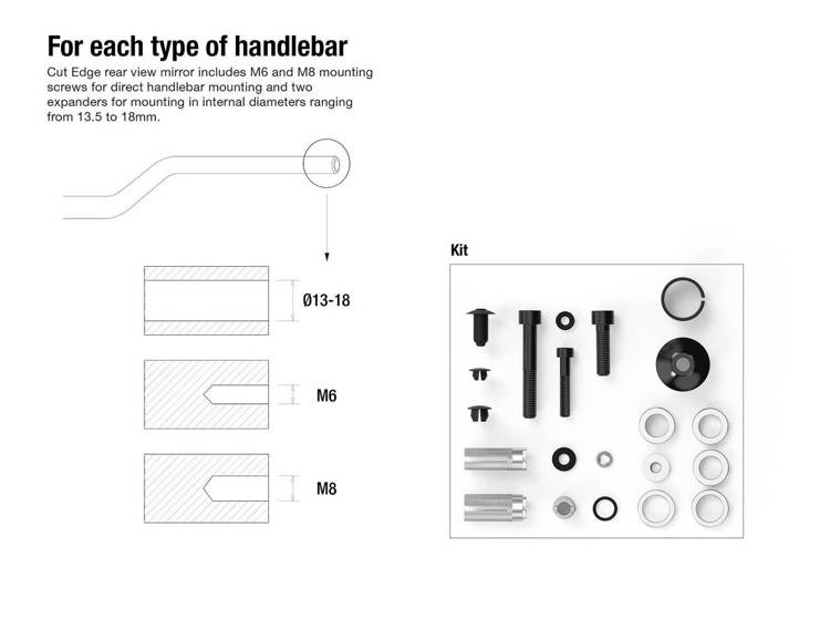 Cut-Edge is easy to install thanks to the included universal mounting Kit, adjustable and equipped with a high-definition mirror engineered to ensure excellent visibility and unprecedent clarity.