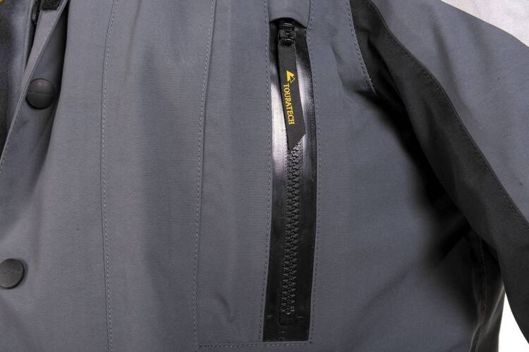 Warto najpierw opróżnić kieszenie i umieścić niezbędne przedmioty w kieszeniach tego kombinezonu. Są one przestronne, łatwo dostępne i - oczywiście - wodoodporne! Touratech wybrał trójwarstwowy laminat GORE-TEX® (CORDURA®). W tym tekstylnym materiale kompozytowym wewnętrzna podszewka, najwyższej jakości oddychająca membrana GORE-TEX® i wytrzymała warstwa zewnętrzna są połączone w jedną tkaninę. Dzięki temu laminat nie jest zbyt gruby, nie wybrzusza się i zawsze dobrze przylega do ciała. Oczywiście najważniejszymi właściwościami kombinezonu są wiatro- i wodoodporność. A ponieważ trójwarstwowy laminat GORE-TEX® (CORDURA®) jest materiałem aktywnym, kombinezon jest w pełni oddychający.