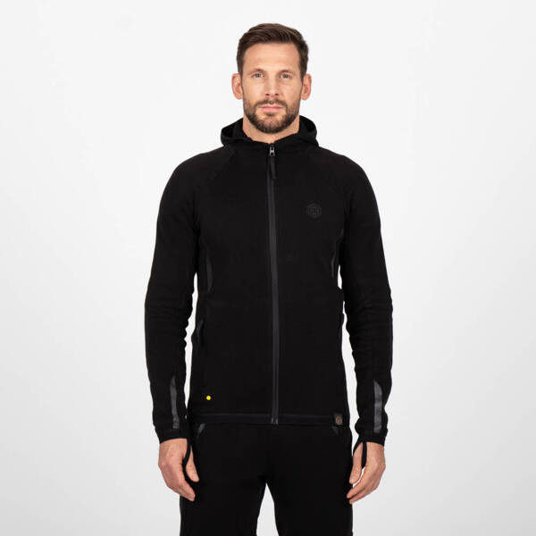 - Bluza z kapturem zapinana na zamek, wykonana z włókien polietylenowych o ultrawysokiej masie cząsteczkowej (UHMWPE), znanych ze swojej wysokiej wytrzymałości, odporności na ścieranie i trwałości, a także mieszanki elastanu i innych włókien zapewniających doskonałą rozciągliwość, elastyczność i wygodę.