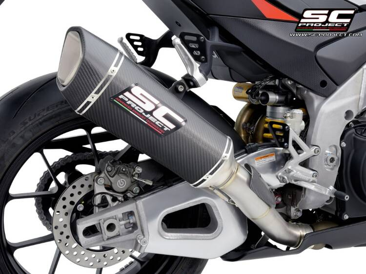 Opracowany podczas wielu lat bliskich relacji między działami Aprilia Racing i SC-Project Race, tłumik SC1-R jest maksymalnym wyrazem mocy, jakości i najnowocześniejszych rozwiązań dla hipersportowych silników 1.100 cm3 wyprodukowanych w Noale. Dzięki obecności ekskluzywnego systemu zaworów z tytanu – opracowanego przez SC-Project dla układów wydechowych MotoGP i WSBK – ten tłumik jest dostępny w krótkiej konfiguracji, o długości zaledwie 250 mm, co zapewnia bardzo agresywny i sportowy wygląd.