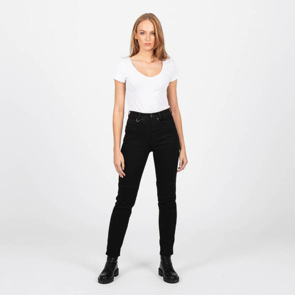 The Rydal is a durable and stylish high-waisted stretch jean designed specifically for female motorcyclists. With a slim fit and CE approved Class AA rating, this jean style provides both comfort and confidence on the road. The denim features a small amount of Lycra for a snug fit and freedom of movement, and the addition of Knox Micro-Lock Compact protectors in the knees and hips offers extra safety without sacrificing comfort. The protectors can be easily removed through the invisible zip on the inside of the knee. Available in black, the Rydal comes in two leg lengths (short and regular 28/30) and a range of sizes from XS to 2XL.
