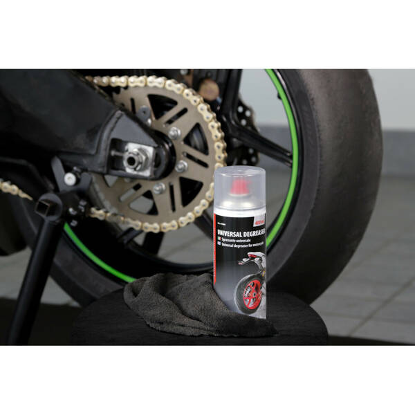 Uniwersalny odtłuszczacz doskonały do każdego rodzaju powierzchni, nie uszkadza włókna węglowego, anodyzowanego aluminium, stali lub tworzyw sztucznych. Skład tego produktu pozwala z łatwością usunąć wszelkiego rodzaju pozostałości organiczne i nieorganiczne. Po czyszczeniu produkt szybko odparowuje. Specjalny zawór 360° i wysokie ciśnienie wewnętrzne ułatwiają odtłuszczanie twardych części.