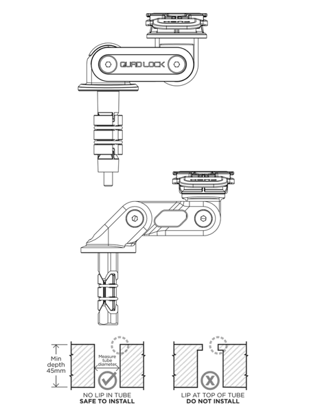 Oba mocowania w sztycę główki ramy Quad Lock są kompatybilne ze wszystkimi etui Quad Lock i uniwersalnym adapterem Quad Lock.