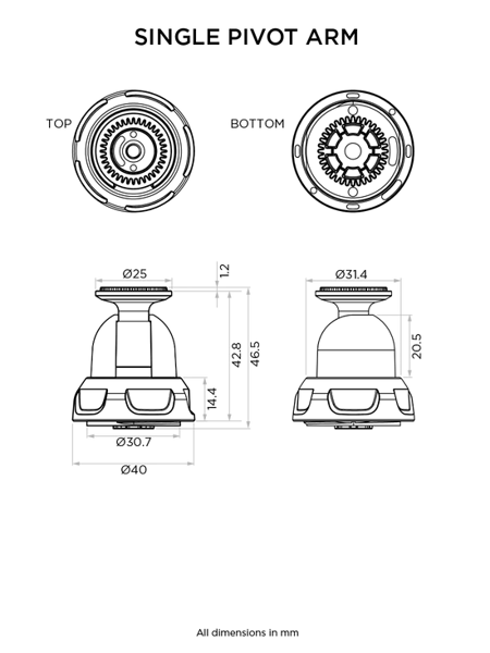 Łatwo regulowana kula ramienia Single Pivot Arm obraca się o 90 stopni w pionie i 360 stopni w poziomie.