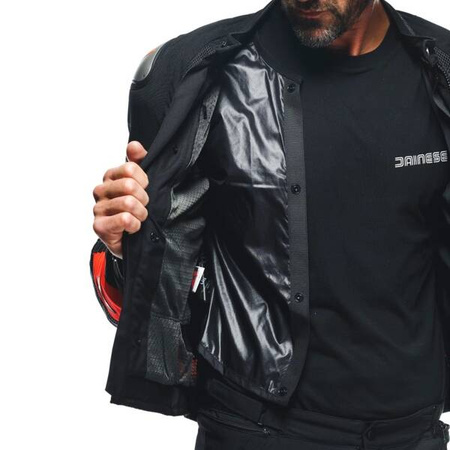 Kurtka motocyklowa Energyca Air Tex jest przeznaczona do podróży na krótkich i średnich dystansach w ciepłym sezonie i zapewnia bardzo ergonomiczną swobodę ruchów, przylegając do linii ciała dzięki konstrukcji z elastycznego materiału Cordura Comfort, który jest bardzo odporny na przetarcia i działa w synergii z regulowanymi opcjami dopasowania przy kołnierzu, talii, rękawach i mankietach oraz z systemem łączenia kurtki ze spodniami. Kurtka Dainese Energyca oferuje doskonałą wszechstronność w zakresie zarządzania temperaturą, biorąc pod uwagę wyjmowaną wiatroodporną podszewkę, która jest przydatna na przejażdżki wysokogórskie lub w chłodniejsze dni. Zdejmij go, aby schłodzić ciało, co osiąga się dzięki dużym panelom z siatki powietrznej, które są luźno splecione z przodu i ciasne po bokach. Jego możliwości regulacji temperatury są dodatkowo zoptymalizowane przez oddychającą wyściółkę Nanofeel® z obróbką jonami srebra. Najwyższy poziom ochrony inspirowany doświadczeniem w zawodach Dainese przekłada się na kompozytowe ochraniacze na ramionach i łokciach. Posiadają certyfikat EN 1621.1, można je zdjąć, a na ramionach znajdują się aluminiowe płyty, które ułatwiają przesuwanie się w przypadku uderzenia o asfalt. Te cechy są wzmocnione przez kieszenie na ochraniacze pleców G1 lub G2 oraz podwójny ochraniacz klatki piersiowej. Dwie zewnętrzne i jedna wewnętrzna kieszeń umożliwiają bezpieczne przechowywanie małych przedmiotów.