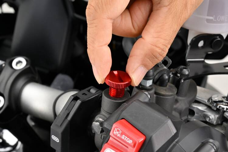 Śruby zaślepiające otwory lusterka CNC z lewym gwintem M10 x P1.25, anodowane na czerwono.