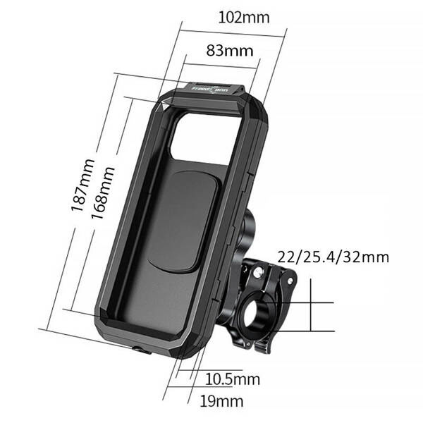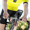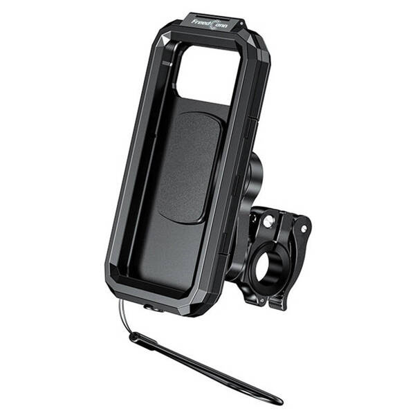 Uchwyt z zaciskiem na kierownicę, wyposażony w wodoodporne etui z ramką przewodzącą dotyk do telefonów.