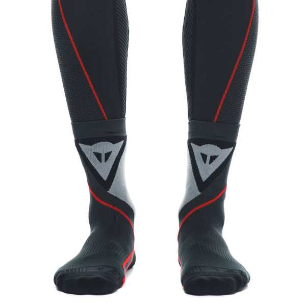 Thermo Mid Socks to średniej długości wersja skarpet izolacyjnych Dainese Thermo, zaprojektowana z myślą o zapewnieniu ergonomii i odpowiedniej termoregulacji w chłodniejszym klimacie. Hydrofobowa i izolująca tkanina Dryarn-Thermo pozwala Thermo Socks zoptymalizować proces zarządzania ciepłem ciała.