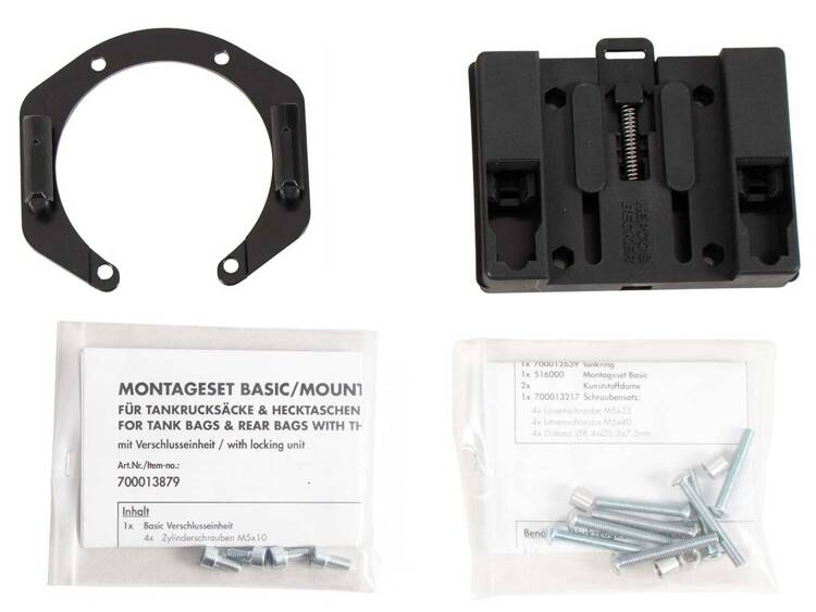 Zakres dostawy obejmuje pierścień zbiornika BASIC, a także zapięcie do tankbagów, które można indywidualnie przykręcić do tankbaga, w zależności od kształtu zbiornika i kąta nachylenia kierownicy.
