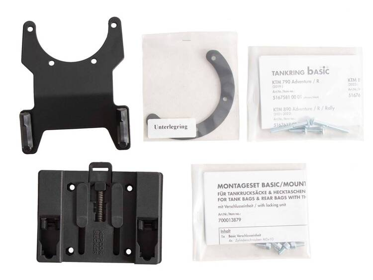 Zakres dostawy obejmuje pierścień zbiornika BASIC, a także zapięcie do tankbagów, które można indywidualnie przykręcić do tankbaga, w zależności od kształtu zbiornika i kąta nachylenia kierownicy.