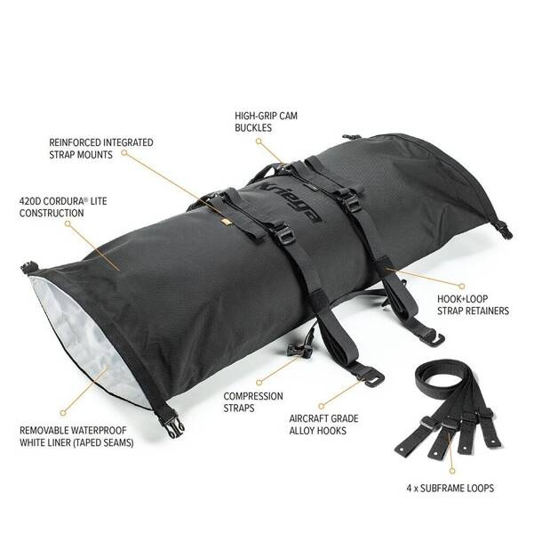 Constructed from a 420D Cordura® LITE* outer shell with a taped seam inner liner. The pack is built to withstand the harshest conditions, providing maximum protection for your belongings. The double-ended roll-top closure provides a flexible waterproof solution with easy access from both ends. The ROLLPACK is designed to fit securely on a rear rack or pillion seat and can be rolled up and carried on the bike or in a backpack when you need extra storage. For quick and easy fitting the integrated cam-buckle straps loop around the bike frame and ‘hook-back’ to the pack. In addition, Subframe-Loops are included for motorcycles with no visible frame or rack. Once fitted to the bike simply hook the integrated straps onto the Subframe-Loops and tighten down. With a 20-Litre capacity, this tail pack offers ample space for your keep-dry essentials with a build quality that second to none.
