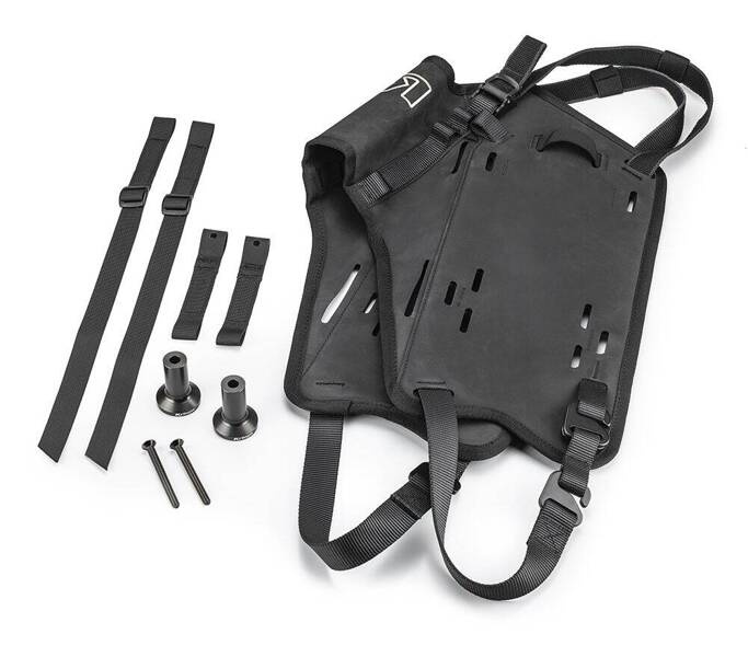 The OS-BASE is an 'over the seat harness' for mounting OS-6, OS-12, or OS-18 ADVENTURE PACKS as soft panniers, with no need for metal frames. This system provides a super-tough, lightweight carrying solution, with no bodywork alterations needed. The fitting hardware gives the flexibility to mount a one, two, or three-pack set-up, depending on your type of ride. The set-length straps make mounting quick and easy, and the custom shape provides a tight, secure fit with plenty of distance from the exhaust. It takes less than a minute to mount and just seconds to remove it.