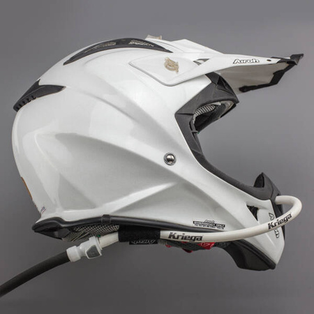 A flexible white silicone tube fits along the base of the helmet with a Velcro® patch which fixes to the inside of the helmet under the cheek pads. The tube pushes through a hole in the front air vent so that the soft bite valve is in the right position. A quick-release dry-break valve makes it easy to remove your helmet whilst wearing a the backpack.