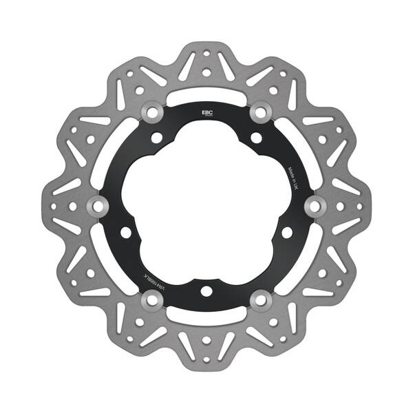 Tarcze Sport Bike Disc z serii VEE marki EBC Brakes, o czarnym centrum, są ręcznie budowane i poddawane szczegółowej kontroli tolerancji. Ich ultra lekka, ale jednocześnie wytrzymała konstrukcja sprawia, że są idealnym ulepszeniem OEM. Zastosowanie opatentowanego systemu przycisków o kwadratowym napędzie zapobiega luzowaniu i wibracjom, co jest typowe dla tańszych, okrągłych nitów lub przycisków.