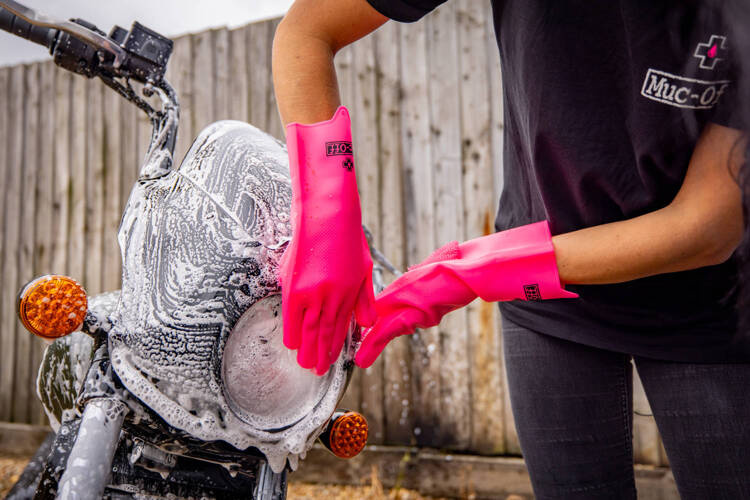 Просто збризніть місце, яке ви хочете очистити (або ваші рукавички), нашим засобом для чищення мотоциклів або піною та скрабом.