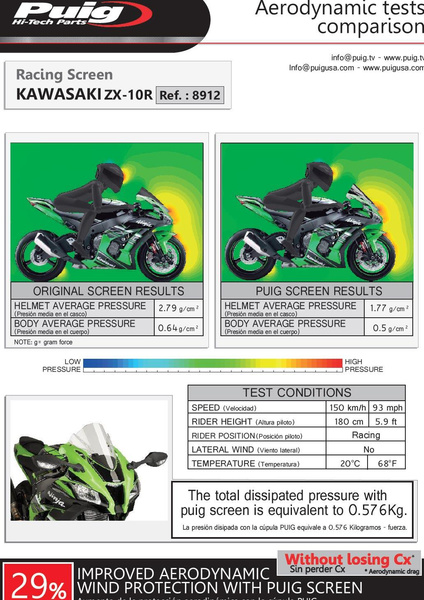 Outlet - szyba po przymiarce, posiada kilka mikrozarysowań (widoczne z bardzo małej odległości i pod światło), odpowiada stanowi po montażu. Reszta jak nowa. Brak oryginalnego worka. Sportowa szyba PUIG - z charakterystycznym, dodatkowym garbem w środkowej części poprawiającym aerodynamikę (double bubble, podwójny garb). Zaprojektowana w wirtualnym tunelu aerodynamicznym. Wysoka jakość optyczna (akryl). Mocowana w miejsce fabrycznej, za pomocą fabrycznych śrub. Posiada niemiecki atest TUV.