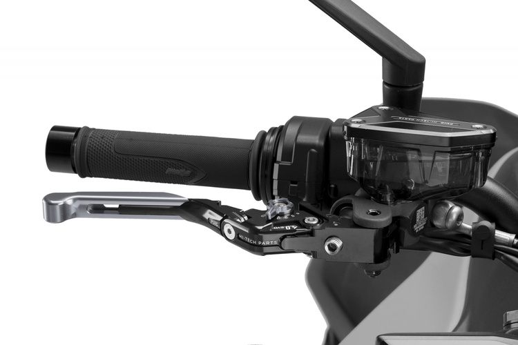 Sportowa dźwignia hamulca PUIG. Wersja z zawiasem 90 stopni, sześciostopniową regulacją i kolorowym przedłużeniem.