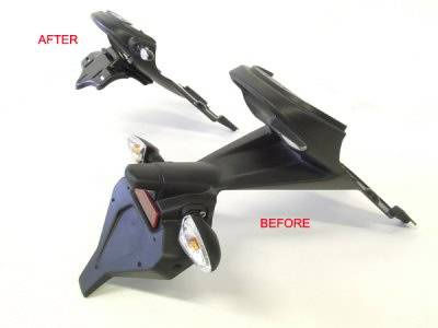 Mocowania tablicy rejestracyjnej (Tail Tidy) - docenione przez wiele zagranicznych magazynów motocyklowych (Performance Bikes, Fast Bikes, SuperBike Magazine oraz MCN). Zaprojektowany tak aby zastąpić duże, fabryczne, brzydkie. plastikowe uchwyty tablic rejestracyjnych i optycznie poprawić linie nowoczesnych motocykli. Posiada wszystkie niezbędne otwory do mocowania, w komplecie dostarczana wraz z podświetleniem tablicy rejestracyjnej.