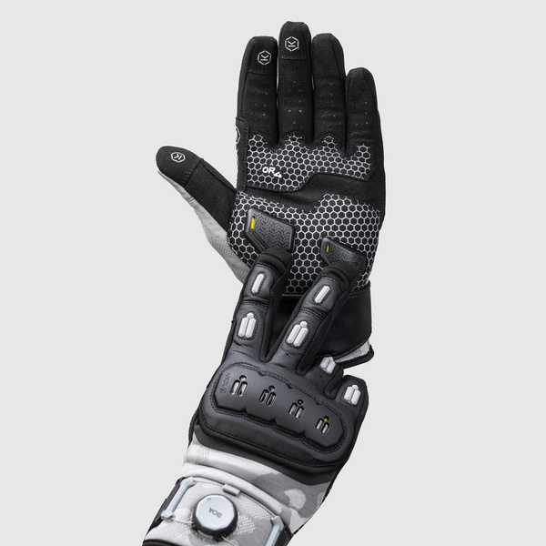 Nowość na 2024 – model Orsa OR4. Uwielbiany i najlepiej sprzedający się Orsa OR3 przeszedł metamorfozę, zyskując technologiczną, całkowicie czarną dzianinę o teksturze monochromatycznego kamuflażu jako bazę materiałową. Czarne Clarino zostało wykorzystane w oddychającej części dłoni, z dodatkową nakładką Amara dla lepszego chwytu na kontrolkach.
