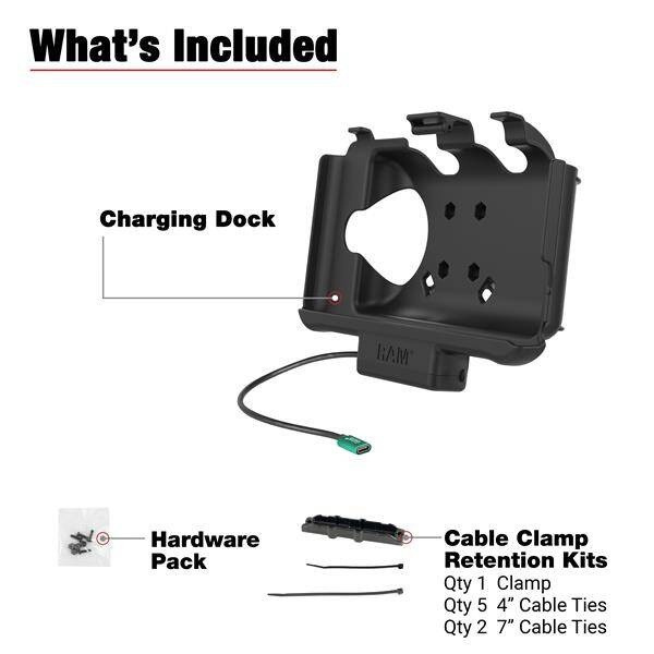 - Zasilana stacja dokująca RAM® EZ-Roll'r™ zaprojektowana specjalnie dla tabletu Samsung Galaxy Tab Active3; zapewnia ładowanie za pomocą zintegrowanego złącza pogo pin i kabla USB-C.