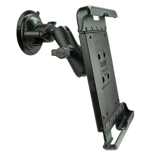 Idealny do przednich szyb samolotów, uchwyt RAM Tab-Tite na tablety 8" z etui składa się z podstawy przyssawki RAM Twist-Lock o średnicy 3,3" i ramienia z podwójnym gniazdem średniej długości. Uchwyt został zaprojektowany z opatentowaną gumową kulką i gniazdem RAM o średnicy 1 cala w rozmiarze B, który ma punkty regulacji na obu końcach ramienia z podwójnym gniazdem, co pozwala na prawie nieskończoną regulację i doskonałe kąty widzenia.
