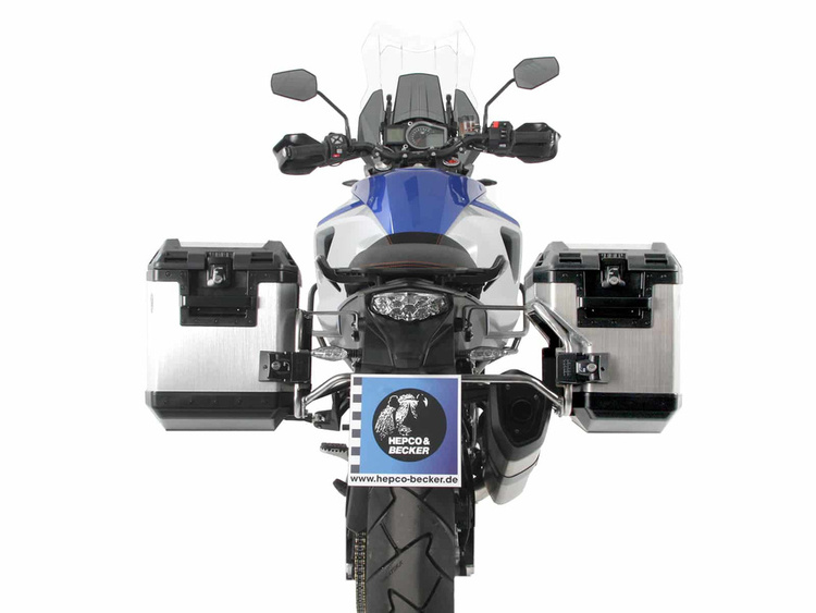 Set of a model-specific, stainless steel sidecarrier on both sides in combination with a Xporer 40 liter and a recessed Xplorer 37 liter case including key, cylinder and the required lock adapters to attach the cases to the carrier