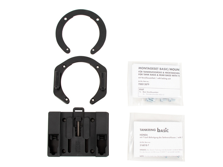 The scope of delivery includes a BASIC tank ring, as well as the fastener for tankbags, which can be individually screwed to the tank bag, depending on the shape of the tank and the angle of the handlebars.