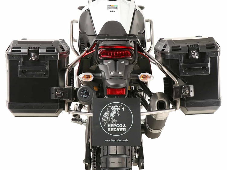 Set of a model-specific, stainless steel sidecarrier on both sides in combination with a Xporer 40 liter and a recessed Xplorer 37 liter case including key, cylinder and the required lock adapters to attach the cases to the carrier