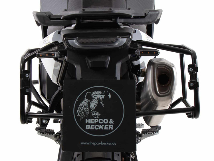 HEPCO&BECKERs standard side carriers are firmly bolted to the motorcycle. All normal hard lugagge cases from Hepco & Becker fit this carrier. The cases are fastened to the carrier by means of a quick release fastener. For this purpose, an aluminum adapter is required which is normally included within the delivery of the case. (Item number: 700114) This aluminum adapter is screwed to the rear right and left of the carrier and offer the holder for the luggage lock.