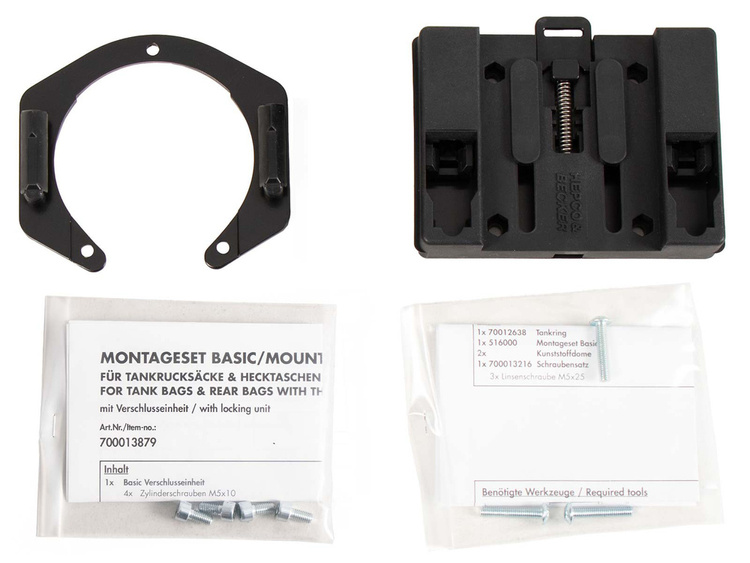 The scope of delivery includes a BASIC tank ring, as well as the fastener for tankbags, which can be individually screwed to the tank bag, depending on the shape of the tank and the angle of the handlebars.