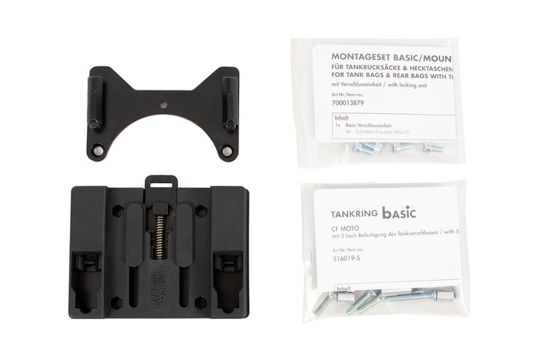 The scope of delivery includes a BASIC tank ring, as well as the fastener for tankbags, which can be individually screwed to the tank bag, depending on the shape of the tank and the angle of the handlebars.
