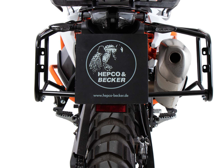 HEPCO&BECKERs standard side carriers are firmly bolted to the motorcycle. All normal hard lugagge cases from Hepco & Becker fit this carrier. The cases are fastened to the carrier by means of a quick release fastener. For this purpose, an aluminum adapter is required which is normally included within the delivery of the case. (Item number: 710135 ) This aluminum adapter is screwed to the rear right and left of the carrier and offer the holder for the luggage lock.