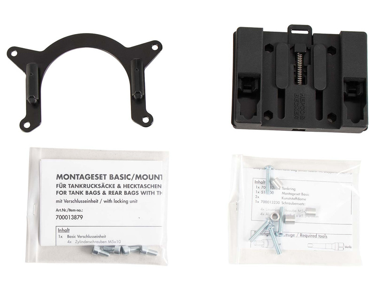 The scope of delivery includes a BASIC tank ring, as well as the fastener for tankbags, which can be individually screwed to the tank bag, depending on the shape of the tank and the angle of the handlebars.