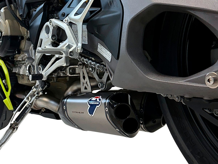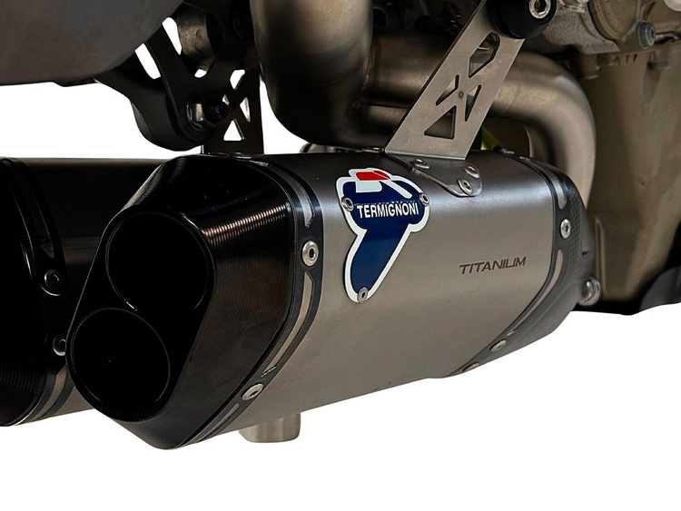 Termignoni opracował zestaw 2025 DUCATI PANIGALE V4 SLIP-ON KIT, który zawiera parę tłumików SYMMETRICAL RACING UNDER-BELT, pasujących do oryginalnych kolektorów wydechowych.
