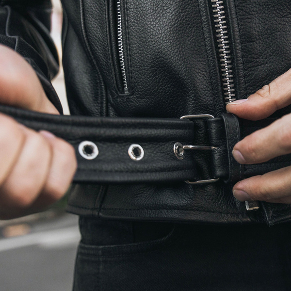 Motocyklowa kurtka skórzana z ochraniaczami łokci i barków CE Level 1 gwarantuje pełną ochronę. Ma dodatkową kieszeń na plecach dającą możliwość dołożenia ochraniacza. Regulacja w pasie pozwala na precyzyjne dopasowanie do każdej sylwetki. Ma kieszenie zewnętrzne i jedną wewnętrzną.
