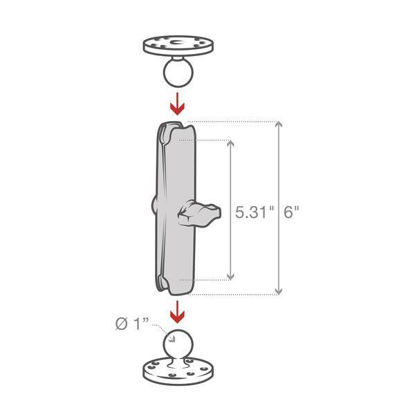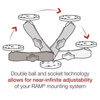 - Mocowanie do dowolnego elementu kulowego RAM® w rozmiarze B, w tym do podstaw montażowych i uchwytów urządzeń; technologia podwójnej kuli i gniazda umożliwia niemal nieograniczoną regulację systemu montażowego RAM®.