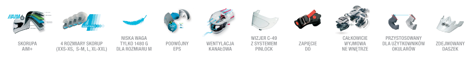 Skorupa kasku z materiału AIM+ Wypełnienie EPS o zróżnicowanej gęstości Wizjer SHOEI CNS-2 o szerokim kącie widzenia Zapięcie typu DD