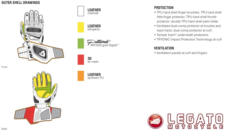 Podszewka – aramidowa wyściółka i tri-fleece wyściółka na mankiecie (47% aramid, 28% poliester, 25% bawełna). Ochrona - wytrzymały i odporny na ścieranie materiał TPU na małym palcu, kciukach i na kłykciach palców, podwójna warstwa wytrzymałego i odpornego na ścieranie materiał TPU na dłoni, wentylowane ochraniacze dual-comp na kłykciach i wierzchniej stronie rękawicy, ochraniacze dual-comp na mankietach, pianka samodopasująca się do kształtu Temperfoam® pod ochraniaczami, na mankietach technologia ochronna TYRONIC, trwałe i wytrzymałe szwy PWR|yarn. Styl racing'owy.