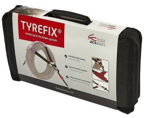 TyreFix® zapewnia bezpieczne mocowanie i całkowitą ochronę. Elastyczny i trwały materiał pasuje do każdego rozmiaru opony. Aby zapobiec ruchowi motocykla, system TyreFix® jest wyposażony w specjalny materiał cierny. Konstrukcja jest w pełni przekrojona, dzięki czemu łatwo ją założyć i zdjąć.