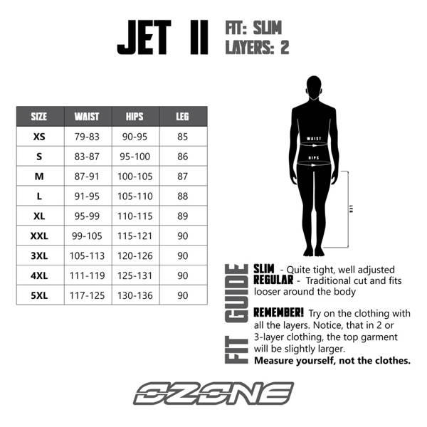 - Zamki: 360° (oraz krótki) umożliwiające połączenie spodni z kurtką, długi zamek na nogawkach