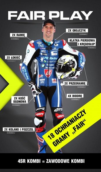 W cenie tego kombinezonu otrzymacie nie tylko slidery i standardowe ochraniacze od włoskiego producenta Betac ale również ochraniacz klatki piersiowej, wkładany ochraniacz kręgosłupa, ochraniacze bioder oraz kości ogonowej. Wszystkie od renomowanej, niemieckiej marki Sas-Tec. Z tak wyposażonym kombinezonem będziecie mogli naśladować zawodowców, którzy nam ufają już wiele lat. Kombinezony motocyklowe 4SR posiadają system 22 ergonomicznie umieszczonych ochraniaczy i tutaj możemy pochwalić się najlepiej wyposażonym, seryjnie produkowanym kombinezonem na rynku.